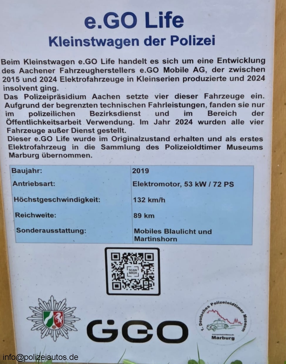 | Beschreibung: | Viersitziger, elektrisch angetriebener Kleinstwagen der Polizei Nordrhein-Westfalen.Die insgesamt vier beschafften Fahrzeuge fanden im polizeilichen Bezirksdienst und im Rahmen der Öffentlichkeitsarbeit Verwendung. |