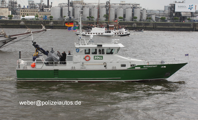 | Beschreibung: | Am 25.11.2011 wurde das neue Boot der Zollverwaltung auf den Namen Glückstadt getauft. Bei der "Glückstadt" handelt es sich um ein Einsatzfahrzeug mit einer Länge von 23,65 Metern und einer Breite von 5,60 Metern. Die Geschwindigkeit beträgt 22 Knoten und zwei jeweils 1064 PS starke Motoren sorgen für den Antrieb. Die "Glückstadt" wird künftig bei der Überwachung der Zollstrasse Elbe und in dem Bereich der Elbmündung eingesetzt. (PM der Bundesfinanzdirektion Nord, Hamburg (auszugsweise)). Die Fotos entstanden beim Hamburger Hafengeburtstag am 11.05.2012. Die neue Glückstadt ist bereits das dritte Schiff der Zollverwaltung das diesen Namen trägt. Hier ein bißchen aus der Geschichte: 1954 läuft das hochseetüchtige Zollboot "Jade" auf der Buschmann Werft in Hamburg vom Stapel. Einsatzgebiet: Deutsche Bucht. 1964 wird die "Jade" von der Oberfinanzdirektion in Kiel übernommen und umbenannt. Sie erhält den Namen "Glückstadt". Heimathafen: Hamburg. Einsatzgebiet: Unterelbe. 1990 wird die alte "Glückstadt" aus dem aktiven Dienst entlassen. Der Ruhestand sollte nicht lange dauern. Aufgrund der Wiedervereinigung wurden im Ostseeraum Zollboote zur Überwachung der Zollgrenze zwischen Lübeck und Swinemünde benötigt. Noch im selben Jahr wird die "Glückstadt" reaktiviert und in Saßnitz auf Rügen unter dem Namen "Hiddensee" stationiert. 1993 kehrt die "Hiddensee" mit eigener Kraft nach Hamburg zurück. Hier wird sie zum Museumsschiff umgebaut und findet unter ihrem alten Namen "Glückstadt" an der Pontonanlage vor dem Deutschen Zollmuseum ihren letzten Arbeitsplatz. Am 22. Juni 2005 verlässt die "Glückstadt" über den Zollkanal die Speicherstadt - nicht mit eigener Kraft, sie wird abgeschleppt. Das Ziel dieser letzten Reise ist eine Werft in Finkenwerder - Verschrottung. Warum? Der Stahlrumpf der "Glückstadt" war durchgerostet. Somit war die Sicherheit auf dem Schiff nicht mehr gewährleistet. Eine Reparatur wäre zu teuer geworden. Hier nachzulesen. Im Rahmen eines Werftaufenthaltes wurde das Boot in 2017 neu lackiert. |