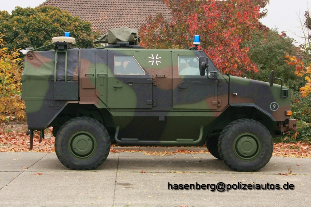 | Beschreibung: | Gepanzertes Patrouillenfahrzeug der Feldjäger. Hier ist der Dingo 1 von KMW in der Ausführung für die Feldjägertruppe zusehen. Die Version Feldjäger verfügt als einzige über eine Sosi Anlage mit Autsteckblaulichtern und Frontblitzern. |