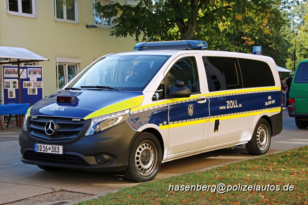 Ausgebaut durch die Fa. Binz in Illmenau. Im Einsatz seit 2019. Diese Fahrzeuggeneration ist die erste die in der neuen Farbgebung des Zoll ausgeliefert wird (blau mit VESBA Design Beklebung). Auf der Motorhaube und hinter der Heckscheibe befindet sich der Anhaltesignalgeber. |