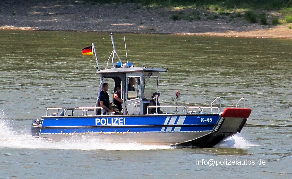 Boot K-45 der Bereitschaftspolizei Nordrhein-Westfalen, hier auf dem Rhein unterwegs.