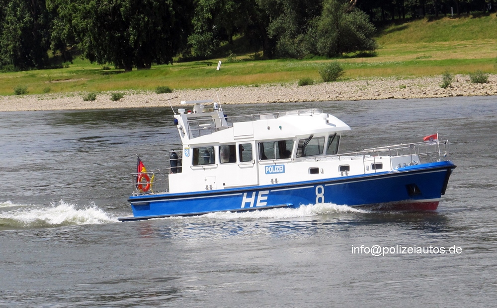 Streifenboot 8 der Wasserschutzpolizei Hessen, hier unterwegs auf dem Rhein bei Köln Mülheim.