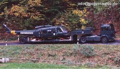 Sattelzugmaschine mit Tieflader, beladen mit Hubschrauber "Bell UH-1D" - Foto: Uwe Gorzynski -
