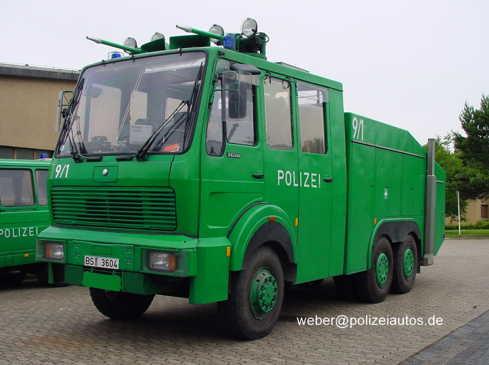| Beschreibung: | Wasserwerfer 9000 der niedersächsischen Bereitschaftspolizei, hier mit Kennung 9/1 Technische Daten: 280 PS Höchstgeschwindigkeit: 105 km/h 16 Vorwärts- und 2 Rückwärtsgänge Wassermenge: 9070 Liter Tankinhalt Besatzung: 5 Beamte. Bei diesem Fahrzeug werden die Auspuffabgase über Edelstahlrohre (seitlich am Wassertank angebracht) nach oben abgegeben. Hier eine Ausführung ohne diese Vorrichtung. |