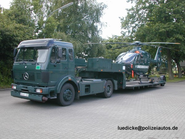 Sattelzugmaschine mit Tieflader, beladen mit Hubschrauber "EC 135"
