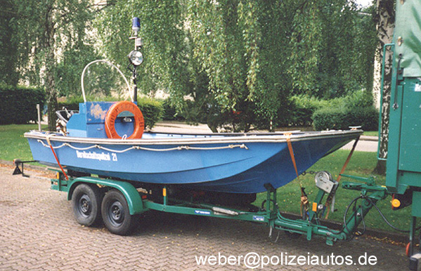 Boot 21 der Tauchergruppe der Bereitschaftspolizei Niedersachsen auf einem Trailer.