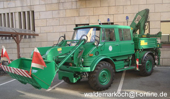 Zugmaschine mit Ladeschaufel und HIAB-Kran.