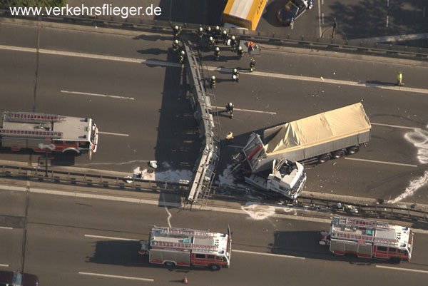| Beschreibung: | Während der Fahrt hob sich der Aufbau vom Sattelauflieger an, der Lkw kam ins Schleudern und riss die gesamte Verkehrsbeinflussungsanlage (VBA)in Höhe der AS Tempelhofer Damm/BAB 100 aus ihrer Verankerung. Foto: www.verkehrsflieger.de |