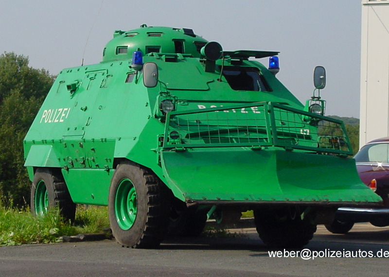 | Beschreibung: | Sonderwagen UR 416 (ex HB-3289) der Bremer Polizei. Das Fahrzeug war dort bis 1966 eingesetzt und befindet sich heute im Bestand des Polizeioldtimer-Museum Marburg. Technische Daten Baujahr: 1977 Karosserie: Rheinstahl Fahrwerk: Mercedes-Benz Unimog Antriebsart: 2,8 L-Dieselmotor/ Allradantrieb/ 125 PS Länge 5 m, Breite: 2,28m, Höhe: 2,57 m Leergewicht: 6700 kg, zul. Gesamtgewicht: 7600 kg Höchstgeschwindigkeit: 80 km/h Sonderausstattung: vollgeschlossene Karosserie aus 6,5 mm-Panzerstahl, drehbarer Waffenturm, Räumschild, schusssichere Bereifung, Allradgetriebe u.v.m. |