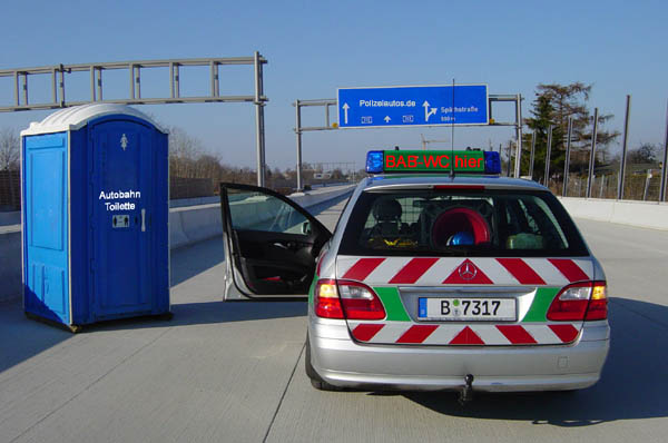 Um bei Verkehrskontrollen von Reisebussen mit Rentnern auf der BAB besser gerüstet zu sein, wurde jetzt das erste mobile Autobahn-WC der Berliner Polizei an den Zentralen Verkehrsdienst übergeben. Das WC kann an verschiedenen Orten, so auch auf dem Seitenstreifen aufgestellt werden. Am Tage der feierlichen Übergabe durch einen führenden Mitarbeiter der ZSE (Herr Haegele), stand es probeweise im linken Fahrstreifen der BAB 113. Das BAB-WC ist für die EU-Angleichung der Polizeifarbe bereits in blau lackiert. Zusätzlich bekommen die Einsatzwagen Autobahn schrittweise neue Hinweisgeber in den RTK 6 SL. |