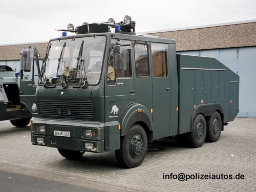 | Beschreibung: | Wasserwerfer 9000 (Wawe 9, Kfz 56/3 gl) Fahrzeug mit Frontblitzern, bei dem Fahrgestell handelt es sich um ein Mercedes-Benz 2628 AK 6x6, das angebrachte Typenschild 2648 stammt nur aus einer optischen Aufwertung des Fahrzeuges. Zwischenzeitlich (2013) hat dieser Wawe nach Standortwechsel auch einige optische Veränderungen erhalten. Fotos: Alex Kirchhofer |
