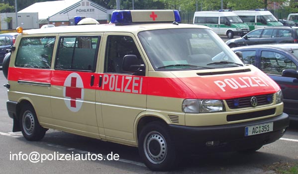 Krankenkraftwagen mit großer POLIZEI-Beschriftung.