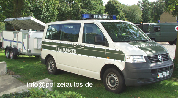 | Beschreibung: | VW T 5 der Feldjägertruppe mit angehängtem Hundetransportanhänger für den Transport von sechs Diensthunden. Fotos: Kai Hasenberg |