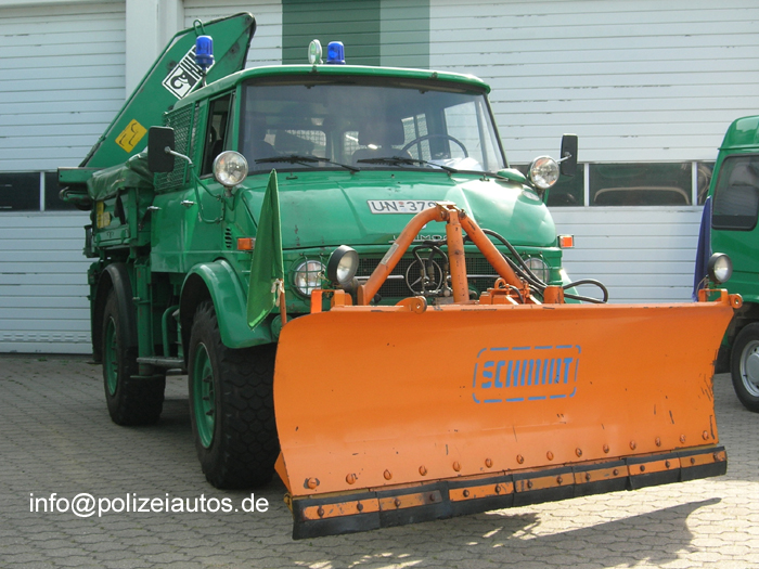 Der Winter kann kommen: Unimog mit angebautem Räumschild.