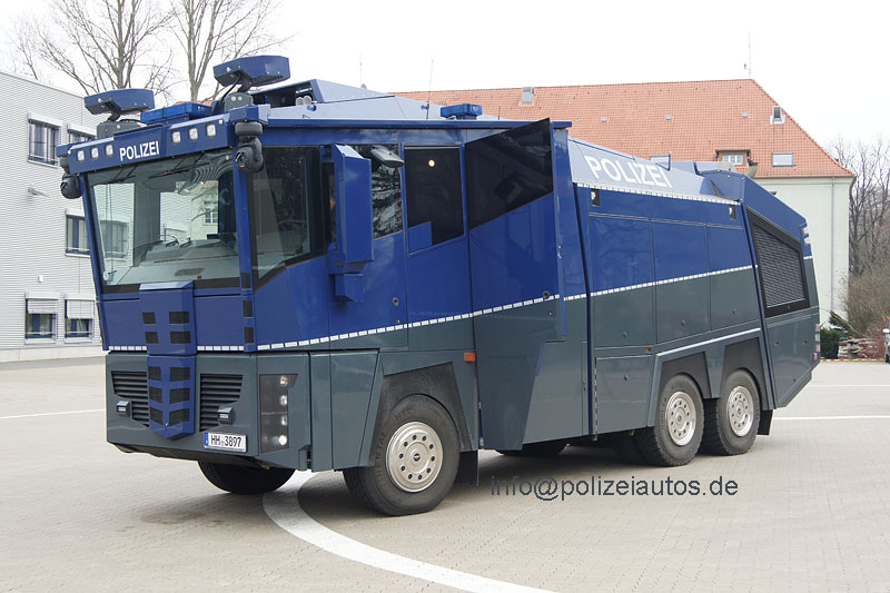 | Beschreibung: | Der WAWE 10 wurde an die Bereitschaftspolizei Hamburg übergeben. Der WAWE ist ingesamt 9,9 Meter lang, 2,55 Meter breit und 3,7 Meter hoch. Rosenbauer gibt ein zulässiges Gesamtgewicht von 31.000 kg an. Im beheizbaren Wassertank werden 10.000 Liter Wasser mitgeführt. Die Pumpenanlage ist im Heck des Fahrzeuges eingebaut und wird mit einem eigenen Pumpenmotor von Deutz angetrieben. Auf dem Dach sind drei Werfer montiert. Fotos: Jörns |