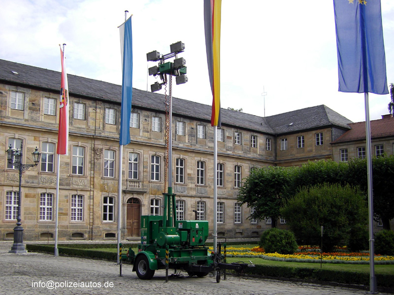 Lichtmastanhänger (Lehmann) der bayerischen Bereitschaftspolizei in ausgefahrenem Zustand.