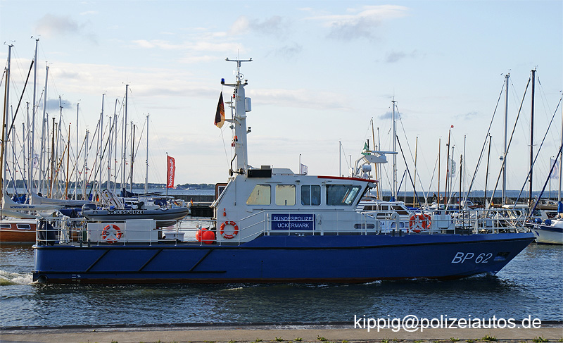 Dieses Boot wurde 2008 von der Schiffs- und Entwicklungsgesellschaft Tangermünde mbH gebaut. Technische Daten: Länge: 22,90m Breite: 5,20m Höhe: 3,20 m / 2,60 m Tiefgang: 1,20m Antriebsleistung: 2 x 588 kw Geschwindigkeit: max.23 Knoten Besatzung: 4 Beamte Schwesterschiffe: BP 61 "Prignitz", BP 63 "Altmark", BP 64 "Börde", BP 65 "Rhön 2" |