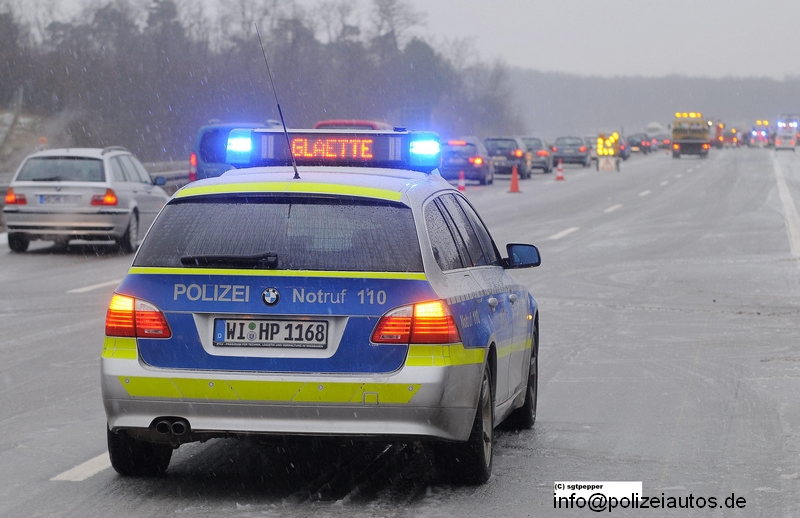 BMW der hessischen Autobahnpolizei im Einsatz wegen Glättebildung.