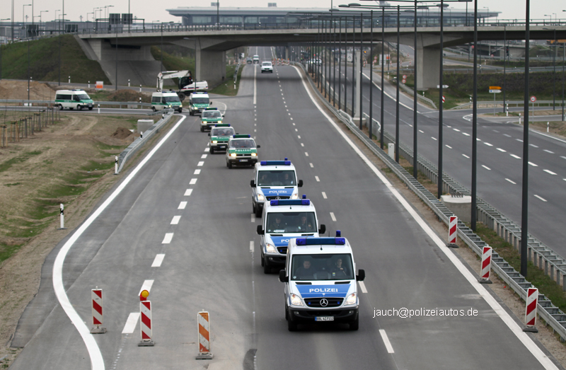Anfahrt von Halbgruppenkraftwagen zu einer simulierten Geiselnahme am neuen Flughafen Berlin-Brandenburg.