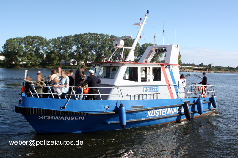 | Beschreibung: | Boot Schwansen der Küstenwache im Rendsburger (2009), bzw. Wedeler (2008) Hafen. Technische Daten: Baujahr: 1984 Länge: 13,11m Breite: 4m Tiefgang: 1,15m Leistung: 594 PS Höchstgeschwindigkeit 19kn 2 Mann Besatzung Rumpf und Aufbauten aus Aluminium. |