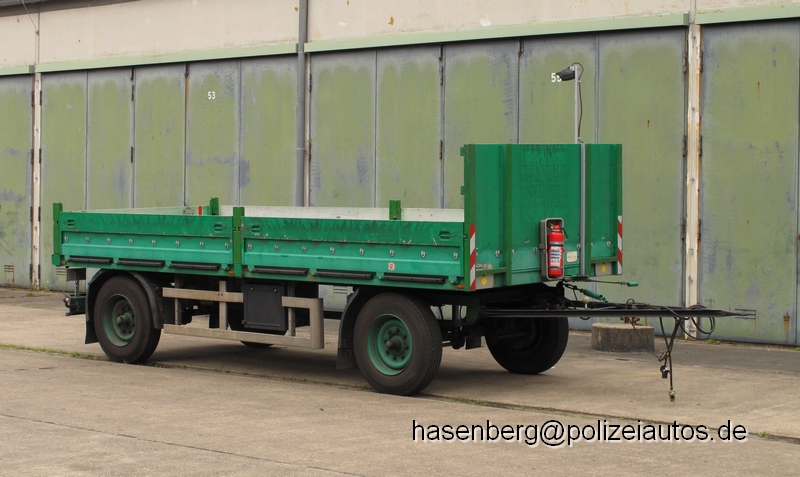 | Beschreibung: | Anhänger der ZPD Oldenburg aus der bundeseinheitlichen Ausstattung, Nutzlast 5t. Der Anhänger wird zum Transport von Hamburger Gittern verwendet. Damit das Fahrzeug mit einer Zumila o.ä. be- oder entladen werden kann wurde die Plane entfernt. Zur Absicherung nach hinten wurde eine orange Rundumkennleuchte am Unterfahrschutz montiert. |