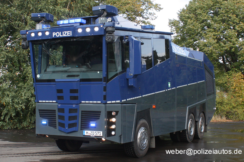 | Beschreibung: | Der erste Wasserwerfer 10000 der nds. Polizei ist ausgeliefert, noch fehlt dem Fahrzeug allerdings die NI-Länderkennung. Technische Daten: Länge: 9.900 mm Breite: 2.550 mm Höhe: 3.700 mm zul. Gewicht VA: 9.000 kg zul. Gewicht HA: 22.000 kg zul. Gesamtgewicht: 31.000 kg Fahrgestell: MB 3341 AK/42/6x6 Actros Leistung: 300 kW (408 PS) Wendekreis: ca. 20 m Kraftstoffinhalt: 300 l Batterien: 2 x 165Ah Notlaufeigenschaft aller Reifen Aufbau: Rosenbauer Kabine: Polycarbonat-Schutzverglasung mit größtmöglicher Rundumsicht, inkl. zusätzlicher Hochdruckwaschanlage, Schutzwirkung bei Durchstich sowie Steinbewurf, Brandsätze, durchschlagstabil gegen Bewurf einer Gehwegplatte aus 12 m Höhe Überdruck- und Außenluftfiltersystem Klimaanlage Zentralverriegelung Standheizung Kabinennotausstieg je Seite Wassertank: Koffertank, Inhalt: 10.000 l Wassertankheizung Pumpenanlage Pumpe N35 mit Deutz TCD 2012L06 Kupplungssystem Storz 1 x Tanksaugleitung 1 x Fremdsaugleitung im Heck Wasserwerfer: 3 x RM12 C Anordnung: 2 x in Front, 1 x im Heck Durchflussmenge: 1.200 l/min Werfer vorne; 900 l/min Werfer hinten Wurfweite: ca.65 m / 50 m (vorne / hinten) Bedienung über Joystick Quelle: Presseinfo (auszugsweise) der Firma Rosenbauer |