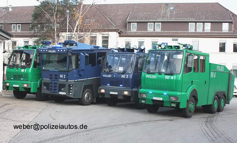 | Beschreibung: | Die 1. Ansicht zeigt die aktuellen (Nov. 2012) nds. Wasserwerfer NI 1- NI 4 (von links nach rechts). Die Wawe 9000 wurden kürzlich mit LED-Frontblitzern nachgerüstet. Auf der 2. Ansicht hat sich zu dem Quartett noch der alte Wawe NI 2 dazugesellt, der vom Wawe 10000 abgelöst wurde und nun außer Dienst gestellt ist. |