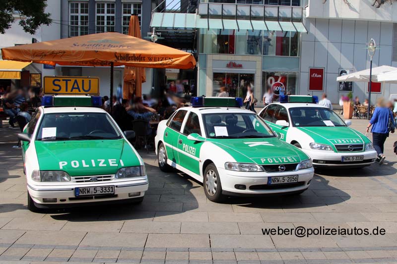 | Beschreibung: | Ehemalige Funkstreifenwagen der Polizei des Landes Nordrhein-Westfalen, von links: Ford Scorpio Fustw. der Autobahnpolizei, im Einsatz von 1994-2001. Technische Daten: 85 kn - 2,0 L - 4-Zyl.-Ottomotor 4-Gang-Automatik-Getriebe (A4 LD) Höchstgeschwindigkeit: 188 km/h Leergewicht: 1420 kg Opel Vectra B Fustw., im Einsatz von 2001 - 2004 Technische Daten: 92 kw - 1,8 L - 4-Zyl.-Ottomotor 4-Gang-Automatic-Getriebe Höchgeschwindigkeit: 200 km/h Leergewicht: 1360 kg Opel Omega B Fustw. der Autobahnpolizei im Einsatz von 2000 - 2002 Technische Daten: 125 km - 2,5 L - 6 Zylinder, Ottomotor 4-Gang-Automatic-Getriebe Höchstgeschwindigkeit: 223 km/h Leergewicht: 1695 kg |