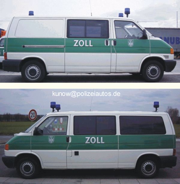 Beschreibung: Seit ca. 2001 werden bei den Mobilen Kontrollgruppen (MKG) die bis dato noch im Einsatz befindlichen manilabeige lackierten Sonder-Kfz T4/LR durch farbenfrohe weiß-minzgrüne Versionen ausgetauscht bzw. ergänzt. Die Inneneinrichtung wurde genauso auf die Bedürfnisse abgestimmt, wie die nun deutlichere ZOLL-Kennung im „Polizei-Look“, die auch bereits bei den Pkw Opel Astra Caravan und VW Golf IV Variant verwendet wird. Die drei hellen Stroboskop-Blitzlampen sind besser zu erkennen als die alten "Rundumlichtfunzeln". Die Anhaltesignalgeber sind nun hinten und vorne vorhanden.