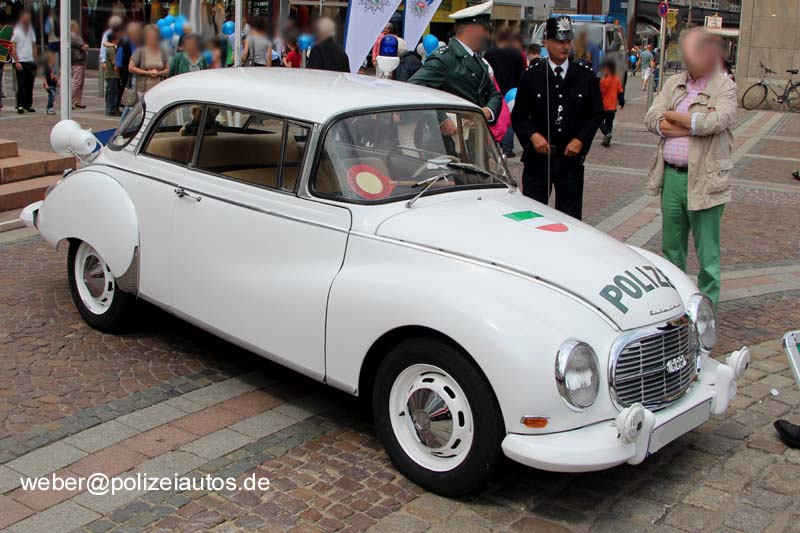 | Beschreibung: | Funkstreifenwagen (a.D.) der Autobahnpolizei des Landes Nordrhein-Westfalen, wie er in den sechziger Jahren, u.a. in Münster, unterwegs war. Technische Daten: Erstzulassung: 06.10.1963 Leistung (KW/PS): 37/50 bei 4500 U/min Höchstgeschwindigkeit: 135 km/h Motor: Dreizylinder-Zweitaktmotor Hubraum: 974 ccm, Leergewicht: 930 kg. Das Fahrzeug befindet sich heute im Privateigentum, der Polizeihistorischen Sammlung Saatkamp. |