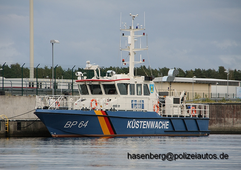 Dieses Boot wurde 2008 von der Schiffs- und Entwicklungsgesellschaft Tangermünde GmbH gebaut. Technische Daten: Länge: 22,90m Breite: 5,20m Höhe: 3,20 m / 2,60 m Tiefgang: 1,20m Antriebsleistung: 2 x 588 kw Geschwindigkeit: max.23 Knoten Besatzung: 4 Beamte Schwesterschiffe: BP 61 "Prignitz", BP 62 "Uckermark", BP 63 "Altmark", BP 65 "Rhön 2" |