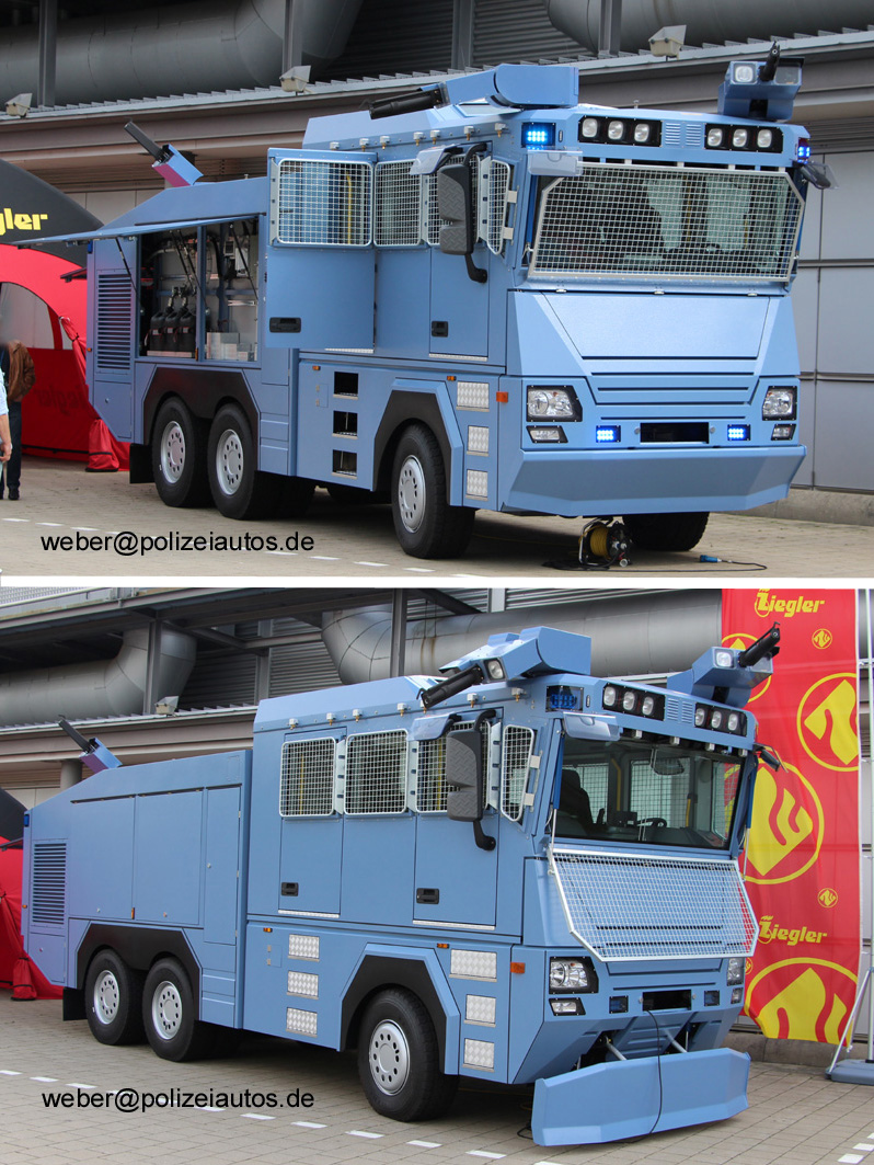 | Beschreibung: | Ziegler (PSV) Public Safety Vehicle (Wasserwerfer 9000), ausgestellt auf der GPEC 2014. Technische Daten: Hersteller Fahrgestell: Mercedes-Benz, bzw. MAN möglich Antrieb: Allrad 6x6 Pumpenaggregat: Albrecht Ziegler GmbH / Deutz Typ: FPN 15-2000 Leistung: bis zu 3000 l/min bei 15 bar Wassertankinhalt: bis zu 9000 l Material: GFK Aufbau: Albert Ziegler GmbH Material: Ganzstahlaufbau Kabine: Besatzung: Sicherheitskabine für Besatzung 1+4 Panzerung: VPAM Level 7 Sicherheit: Überdruckschutzkabine zul. Gesamtgewicht: bis 33000 kg Der Räumschild dient der Beseitigung von Hindernissen und Barrikaden vor dem Fahrzeug. Dieser ist in der Grundstellung an die Stoßstange angeklappt und stellt dadurch keine Beeinträchtigung bei Geländefahrten dar. Im Einsatzfall kann der Räumschild während der Fahrt von der Kabine aus durch den Fahrer und den Kommandanten nach unten und oben gefahren werden. Infos: Albert Ziegler GmbH & Co. KG |