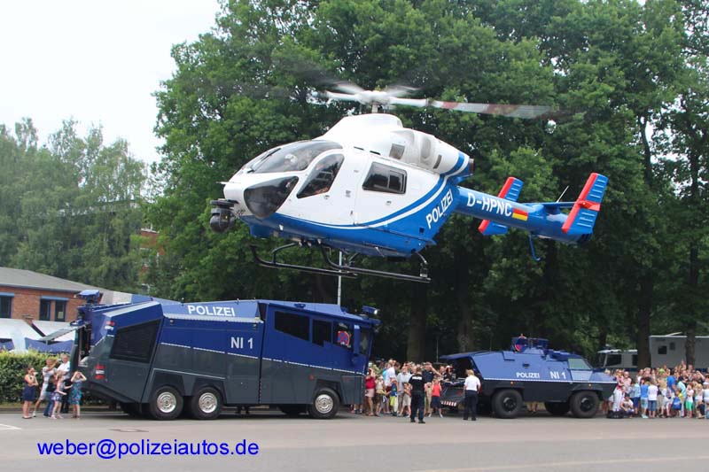 - D-HPNC - erhielt aktuell das neue Farbkleid in blau/weiß. Auch diese MD 902 ist an der Front mit einer Wärmebildkamera ausgerüstet, der Suchscheinwerfer hingegen wurde nicht montiert. Hier ist die Maschine am Tag der offenen Tür der PD Lüneburg am 05.07.2015, in Buchholz i.d.N., zu sehen. Im Hintergrund ist der Sonderwagen SW 4 -NI 1- und der Wasserwerfer 10000 -NI 1-, (neu seit Juni 2015), optisch und technisch gleich mit -NI 2- , zu sehen. |