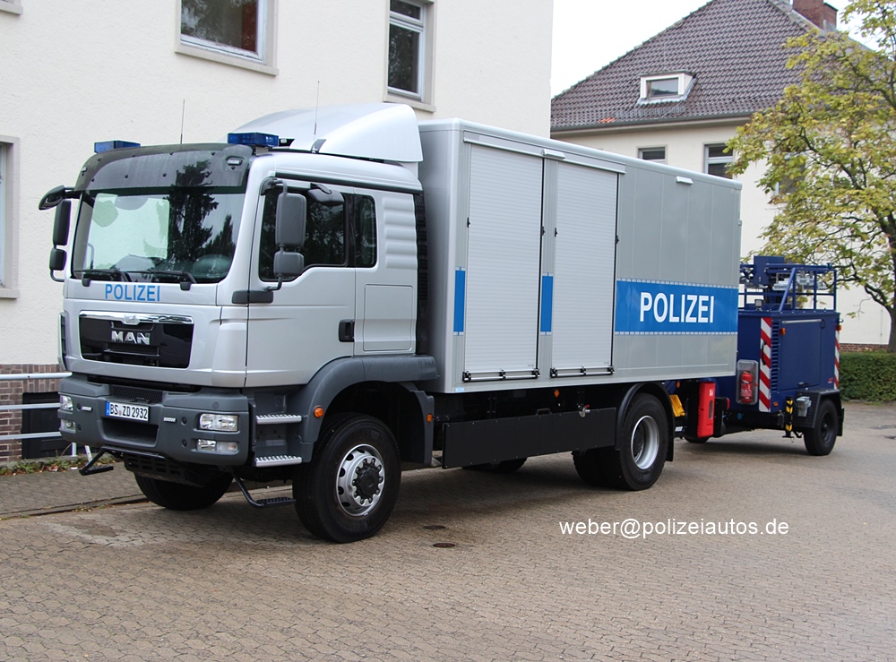 | Beschreibung: | Gerätewagen der Bereitschaftspolizei Niedersachsen mit angehängtem AVS-Lichtmastanhänger |