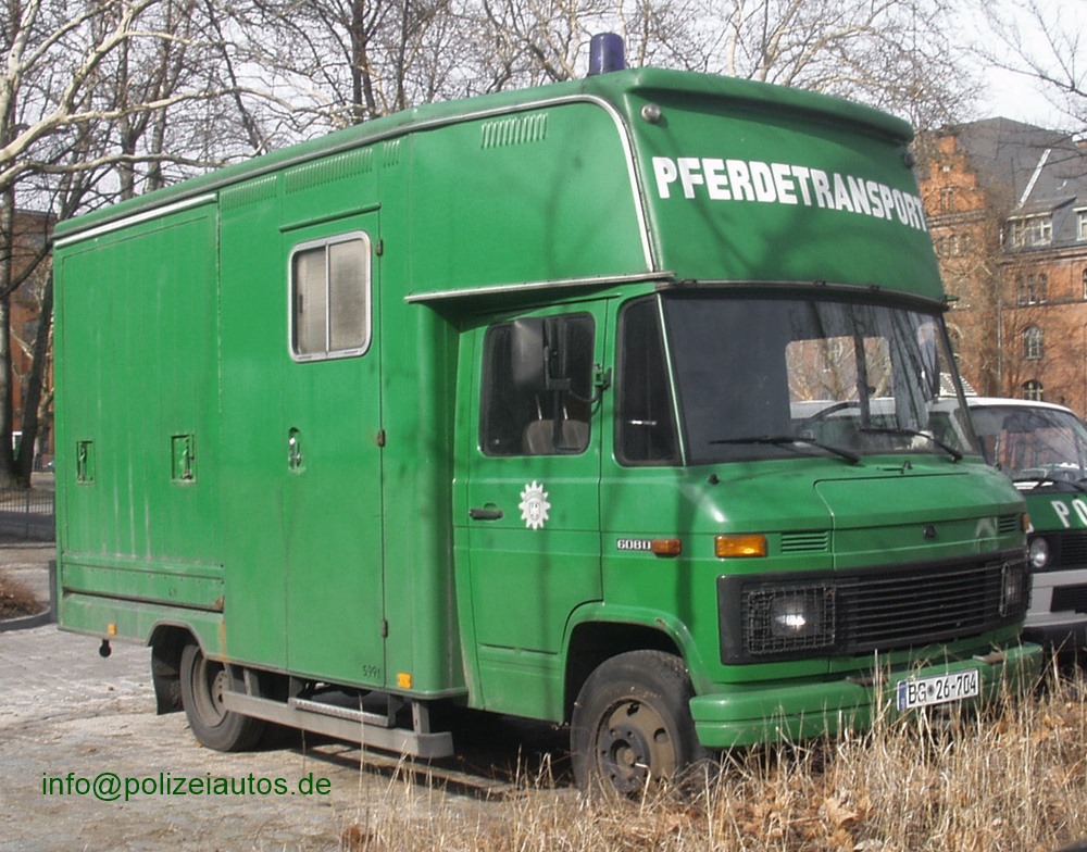 | Beschreibung: | Pferdetransportwagen für zwei Pferde. Die Fahrzeuge der Berliner Polizei-Reiterstaffel wurden vom Bundesgrenzschutz (jetzt Bundespolizei) übernommen. |