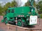 Zugmaschine mit Ladeschaufel und Ladekran zwischen Doppelkabine und Pritsche. Bei der ab 1996 ausgelieferten Folgegeneration auf Mercedes-Benz Unimog U2150 L wurde im Gegensatz zu diesem Fahrzeug der Ladekran am Heck montiert. |