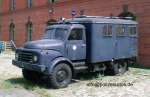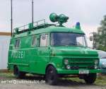 Lautsprecherkraftwagen. Die LauKW dieser Bauart wurden aufgrund der funktechnischen Ausstattung auch als Befehlskraftwagen verwendet. Dieses ehemals blaue Fahrzeug (Beispiel für die ursprüngliche Farbgebung) wurde konsequent grün lackiert. Dies umfasst hier auch die Lautsprecher und den Dachaufbau. Auffällig ist zudem der große POLIZEI-Schriftzug (Abbildung einer weiteren Umlackierung). |