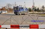 Die Aufnahmen stammen von den Blockupy-Protesttagen im März 2015 in Frankfurt/Main. Der Wawe 10 der bayerischen Bereitschaftspolizei mit der Kennung BY 2 sperrt einen Straßenzug. Auf dem zweiten Foto stehen bayerische Grukw hintereinander aufgereiht, während Einsatzkräfte, u.a. aus Niedersachsen, vorbeilaufen. Fotos: Gottung |