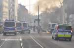 Ein hessisches Einsatzfahrzeug und mehrere niedersächsische Halbgruppenkraftwagen während der Blockupy-Protesttage auf dem Weg zu einem Einsatzort. Fotos: Gottung |