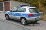 Geländegängiger Funkstreifenwagen, gegenüber diesem VW Tiguan mit anderer Beklebung auf der Motorhaube sowie kleinerem Schriftzug am Heck. - Fotos: Erik Bellmann |