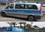 Grün/weiß lackierter VW Bus für Sonderaufgaben. Besonderheit: Das Fahrzeug hat keine fest installierte Sondersignalanlage auf dem Dach, lediglich Frontblitzer im Kühlergrill. Hier wird es mit einer aufgesetzten Magnet-Sondersignalanlage von der Wasserschutzpolizei genutzt. |