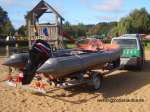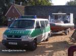 Gespann der Wasserschutzpolizei Schleswig-Holstein. Funkstreifenwagen VW T4 mit Trailer und darauf verladenem Avon SR 4 RIB-Boot mit Mercury-Außenborder. |