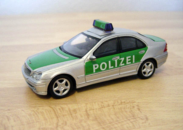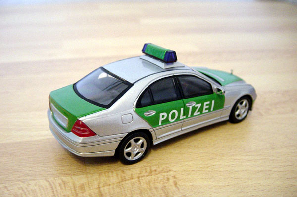 Funkstreifenwagen als Fertigmodell von Schuco mit abgeänderter Blaulichtanlage und nachträglich lackierter Kofferraumklappe. Warum diese nun beim Modell in silber blieb, wird wohl für immer das Geheimnis der Fa. Schuco bleiben. Lackiert wurde mit Humbrol grün (2), da diese Farbe genau den Türen und der Motorhaube entsprach.
