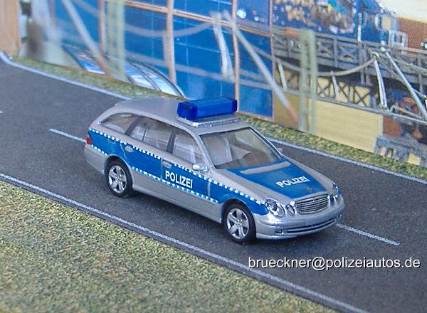 Ein Werbemodell von Mercedes-Benz wurde silber lackiert, mit blauer Farbe bemalt und mit Blaulichtbalken und Beschriftungen ausgestattet. Umbau: Brückner