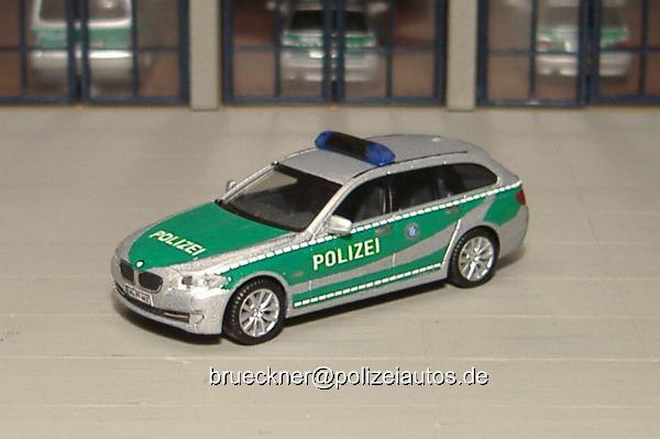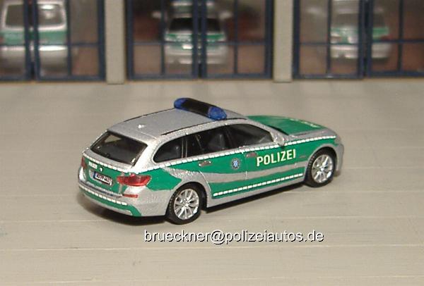 Ein Herpa-Modell wurde silber lackiert und mit den grünen Flächen bemalt. Die Beschriftung wurde mit DS-Decals realisiert. Der Blaulichtbalken ist ein Eigenbau. Umbau: Brückner