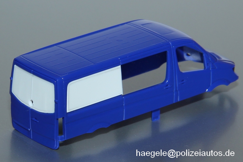 Bei der Planung dieses Modellumbaus war ich ursprünglich von einem Grundmodell mit passender Karosserieform ausgegangen. Nachdem jedoch Neuerscheinungen bei Herpa auch als Halbbus mit bedruckten anstelle von tatsächlich verschlossenen Scheiben erschienen, musste davon ausgegangen werden, dass - anders als bei der Variante mit Hochdach - entsprechende Formen bei Herpa nicht vorhanden sind. Daher habe ich die hinteren Fenster für das vorliegende Modell nunmehr mit Kunststoffplatten selbst verschlossen. Um die Strukturen auch nach dem Lackieren sichtbar und gleichzeitig keine Spalte zu erhalten, ist beim Zuschneiden und Einkleben ein sehr präzises Arbeiten erforderlich.