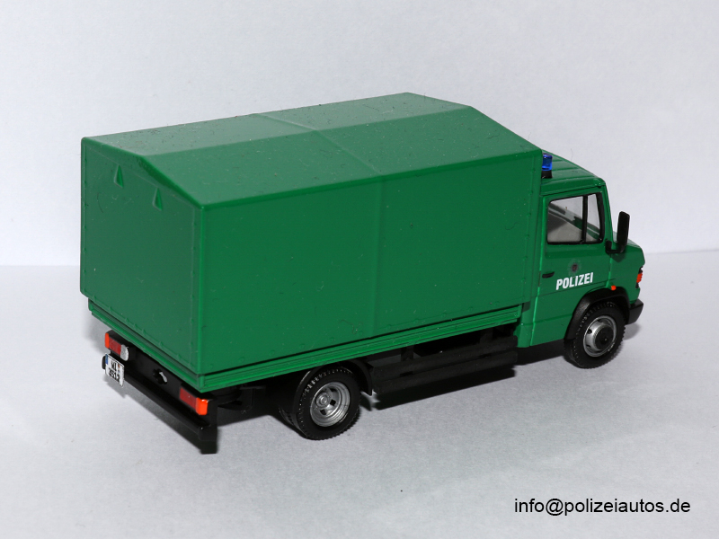 Das Herpa Modell wurde in minzgrün lackiert und mit einem Unterfahrschutz aus Kunststoffprofilen ausgestattet. Die Räder stammen von einem Mercedes-Benz Atego. Antennen, Kennzeichen und Beschriftungen runden den Umbau ab.