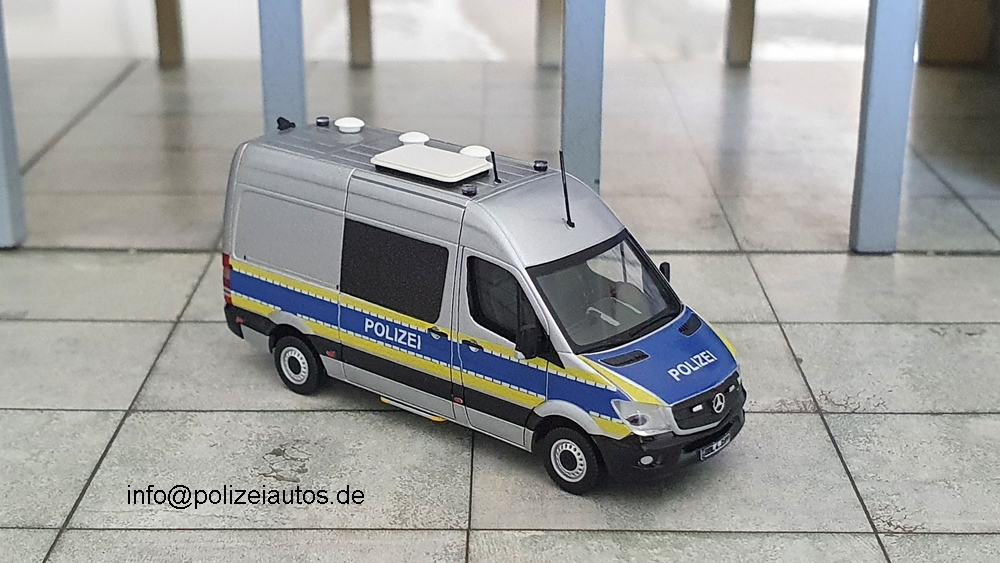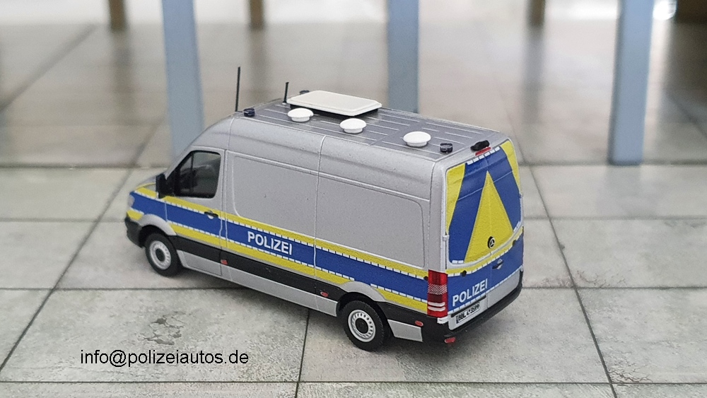 Das Grundmodell eines Kastenwagens von Herpa wurde zerlegt und mittels Airbrush in silber lackiert. Nach dem Trocknen wurden Decals von SRM87 aufgebracht und das Fahrzeug mit Blaulichtern (MMH-Modellbau), Dachlüfter, Dachklimaanlage (Eigenbau aus Evergreen Profilen), Heckkamera, Trittstufe, Frontblitzer und Antennen versehen.