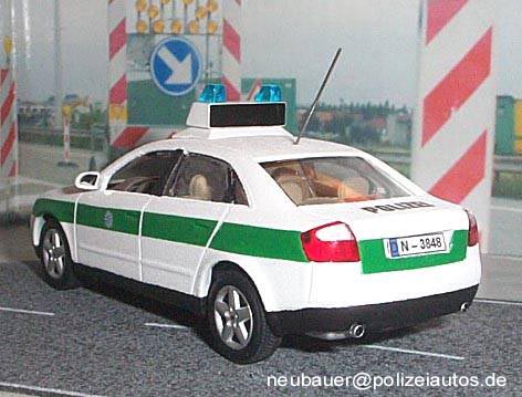 Modell wurde komplett umlackiert. Aufschrift "POLIZEI", sowie die Polizeisterne mit Landeswappen wurden angebracht. Das Modell wurde mit einer Wandel & Goltermann Blaulichtanlage, sowie einer Funkantenne ausgerüstet. (Eigenbau: Neubauer)