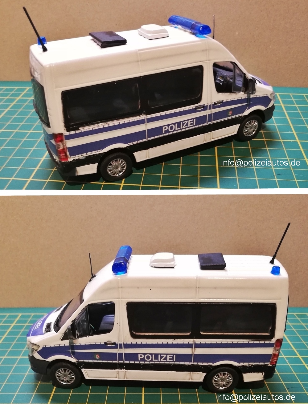 Es wurde demontiert und in weiß lackiert. Nach dem Trocknen und Zusammenbau wurden die Folierung und die NRW-Kennzeichen in 1:43, von der Fa. DS design, angebracht. Die Antennen, Blaulichter, die Klimaanlage und das Dachfenster wurden aus meinem Vorrat ergänzt. Leider gab es in Maßstab 1:43 kein Modell mit Flachdach.